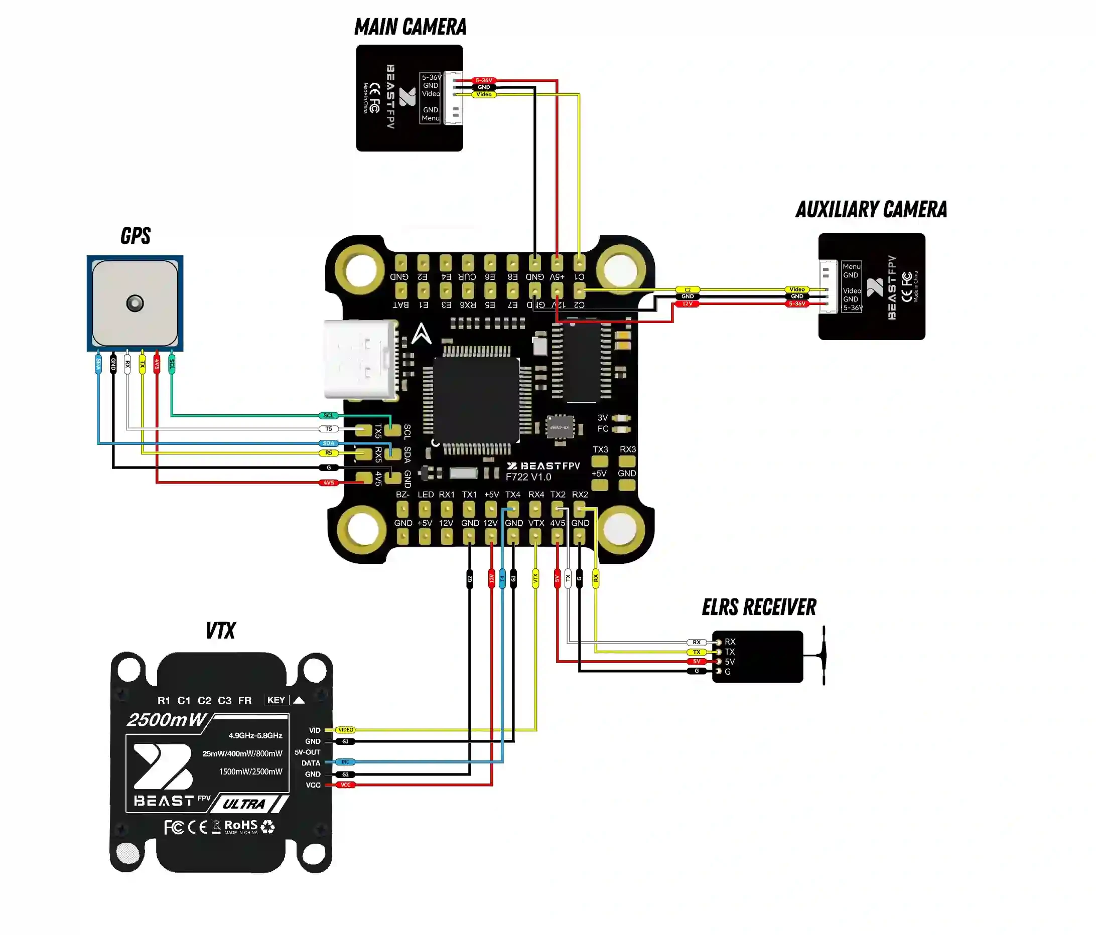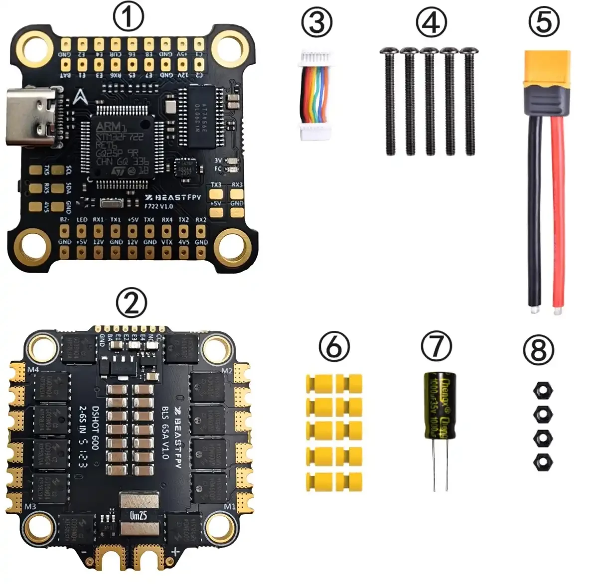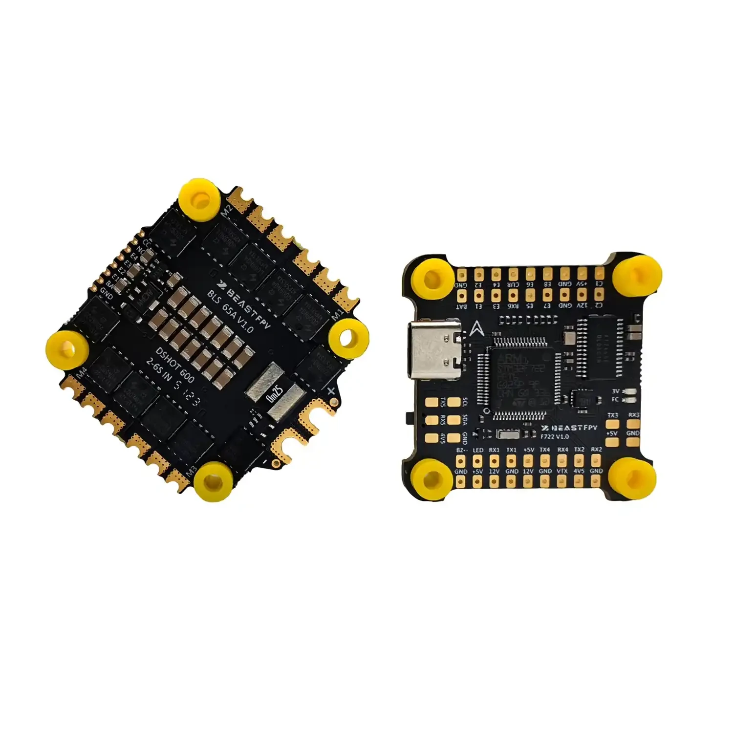 BeastFPV F722 BLS 65 AFC&ESC Stack использует основной чип управления STMF722, поддерживает две камеры, оснащен источником питания 12 В и подходит для 1,2 G и 5,8 G VTX. Stack оснащен системой ESC 4-в-1 мощностью 65А, которая легко справляется с двигателями FPV от 7 до 10 дюймов.